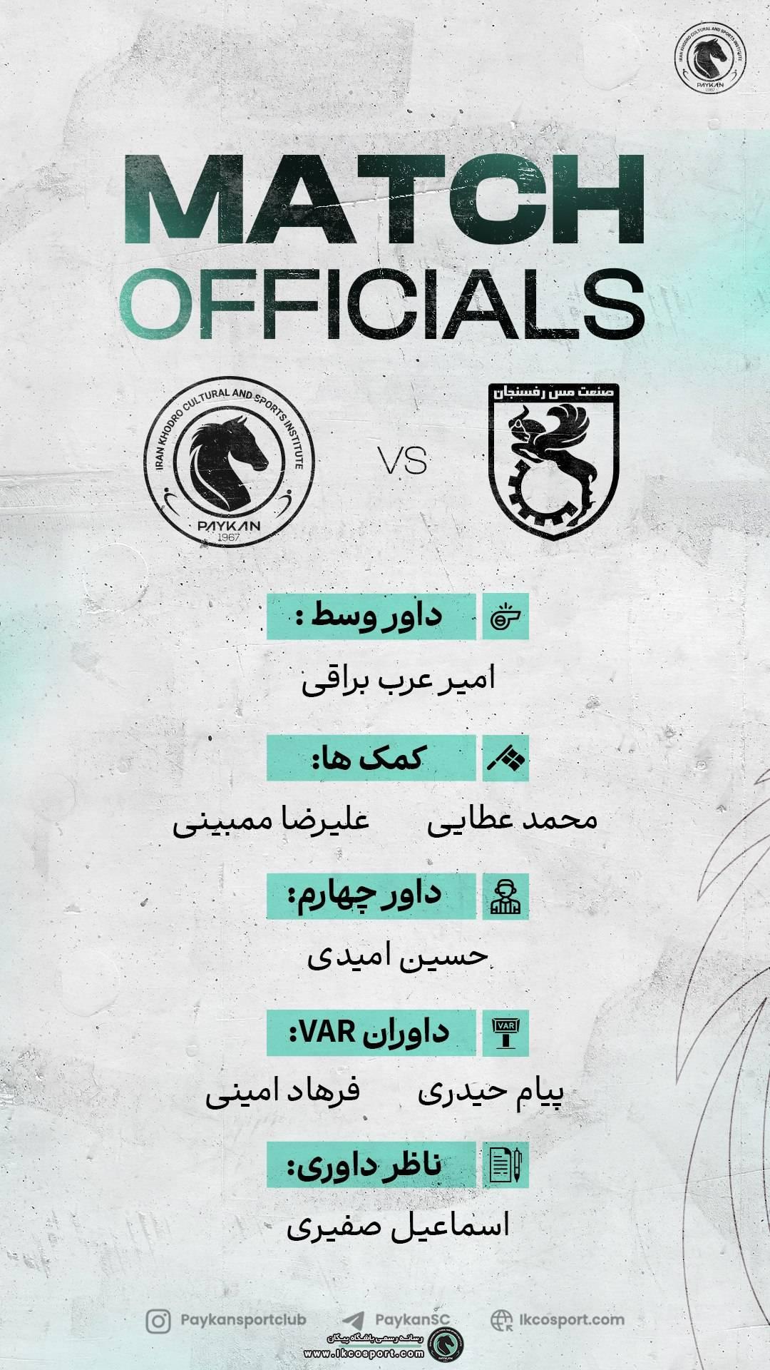 همچنین حسین امیدی به‌عنوان داور چهارم و پیام حیدری به‌همراه فرهاد امینی به‌عنوان داوران VAR در این دیدار حضور خواهند داشت.