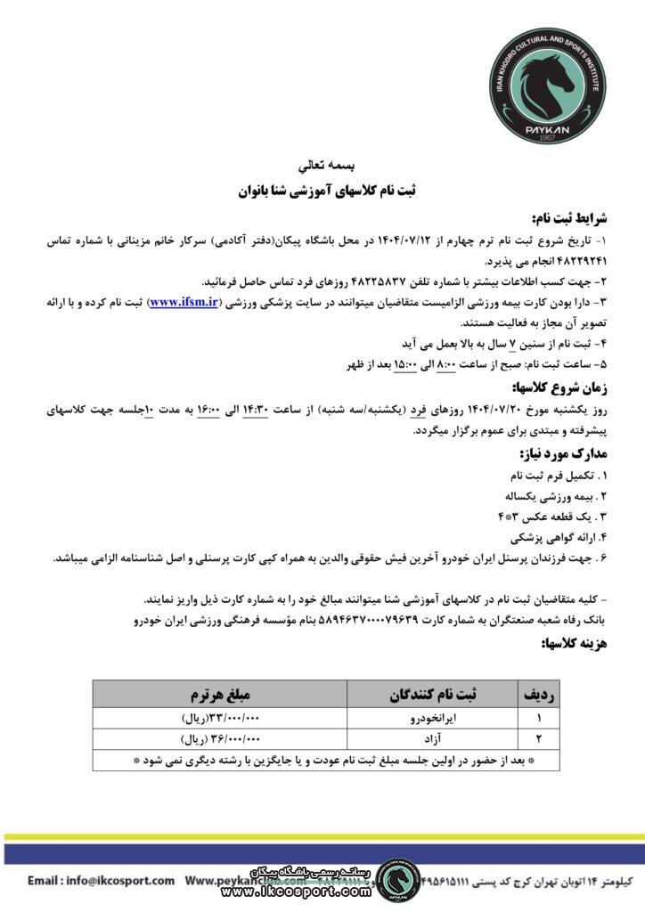 آغاز ثبت نام ترم چهارم کلاس های شنای دختران باشگاه پیکان 1404